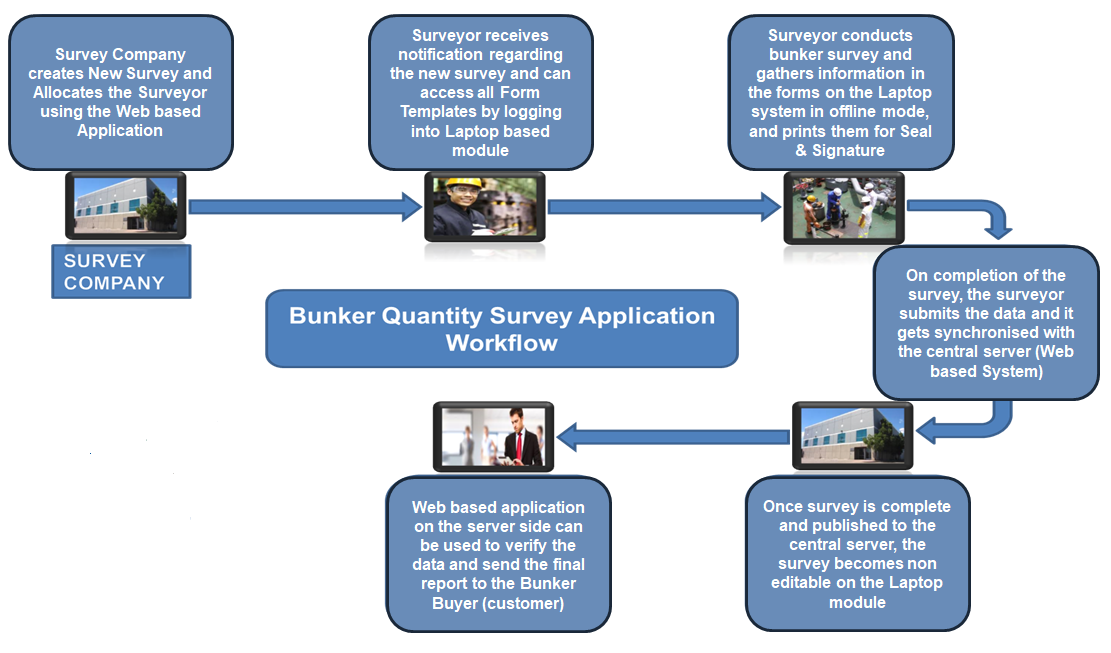 - Application manages the complete workflow of the Bunker Quantity Survey Process.