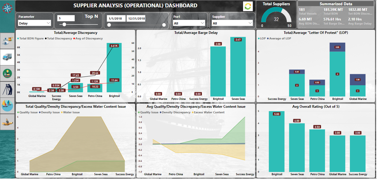 - Data Analytics using Microsoft Power BI to analyse the performance of various entities like Supplier, Surveyor, Bunker Tanker, Barge Representative, Vessel and Vessel C/E, Master.